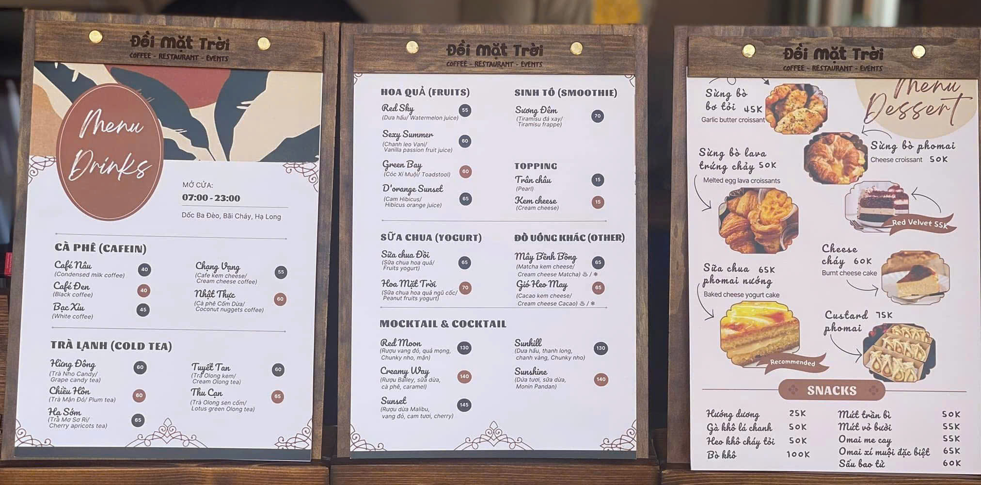 Tối cuối tuần có live music “Thanh Âm Bên Không” – Tuấn Hưng, Vũ từng hát, vibe như concert mini giữa biển trời. Đồ uống đa dạng: Mình Bồng Bềnh, Hè Mộng Mị – tên nghệ mà vị ổn, trang trí đẹp mắt. Giá hơi cao, nhưng view và nhạc sống bù lại hết. Quán cà phê đẹp ở Hạ Long mà chill thế này, bạn phải thử nha!