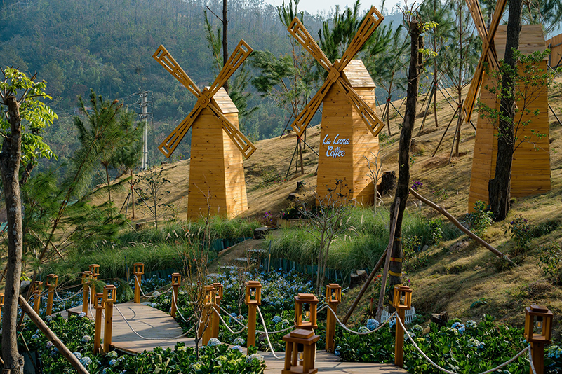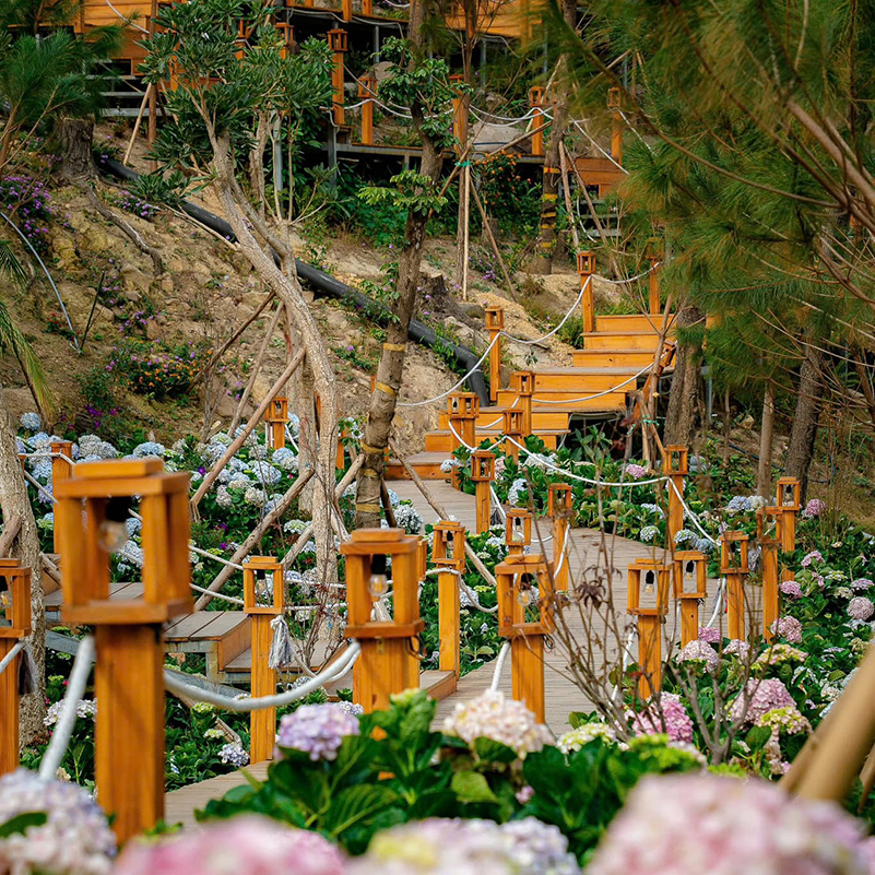 Không chỉ có view xịn, Laluna còn là địa điểm quen thuộc của hội mê nhạc sống với sân khấu hoành tráng và dàn âm thanh cực chất. Sau bão, thông gãy nhiều, nhưng hoa cẩm tú cầu và cây xanh vẫn làm không gian đẹp lạ, hoang sơ mà lãng mạn.