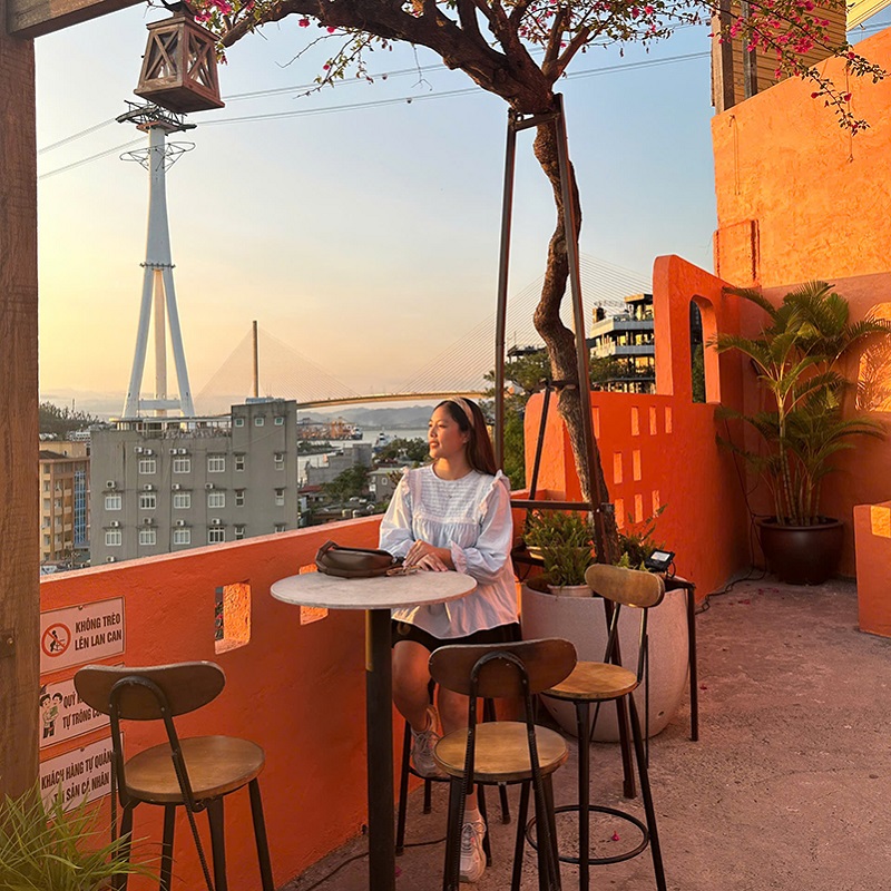 Đồi Mặt Trời là cafe view đẹp Hạ Long mà mình mê ngay từ lần đầu – view rộng, bao trọn vịnh Cửa Lục, tone cam Địa Trung Hải rực rỡ. Quán 3 tầng, tầng thượng ngắm hoàng hôn đẹp “xỉu”, thấy cảng tàu và vòng quay Mặt Trời. Sống ảo thì góc nào cũng “triệu like” – ban công, quầy bar, cầu thang đều xịn!